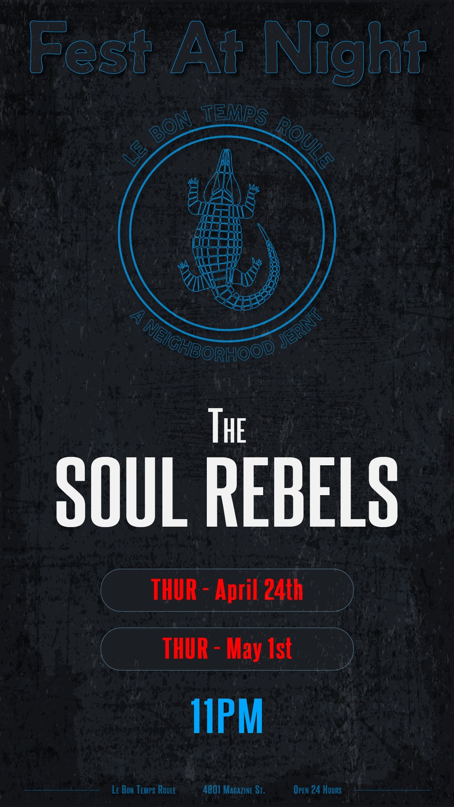 Le Bon Temps Roule "Where New Orleans Comes Alive" Since 2002, The Soul Rebels have turned Thursday nights at Le Bon Temps Roule into one of the most legendary music experiences in New Orleans. This isn’t just a gig, it’s a tradition, a community, and a party that brings everyone together. There’s no VIP section, no walls between rich, famous, or local fans. Everyone comes through the door on equal footing because at Le Bon Temps Roule, love cures all. From Trombone Shorty, Jon Batiste, Wu-Tang Clan, Ed Sheeran, Mos Def, Peyton Manning, and countless others, to lifelong fans who’ve been coming for years, this small but mighty venue has hosted some of the biggest names in music and culture, all grooving together under one roof. It’s intimate, it’s wild, it’s electric, and it’s where some of The Soul Rebels’ most iconic songs were born. Every Thursday night is a chance to dance, connect, and witness the magic of New Orleans music at its purest. Fans come for the music, but they stay for the vibe, the energy, and the sense of family. After more than two decades, The Soul Rebels don’t take a single Thursday for granted. We’re still making history, still creating unforgettable moments, and still ready to welcome everyone, old friends, new fans, and anyone who wants to feel the heartbeat of New Orleans. ✨ This is more than a show, it’s a movement. Come see why Le Bon Temps Roule has been the city’s Thursday night destination for over 20 years. We can’t wait to see you there!